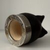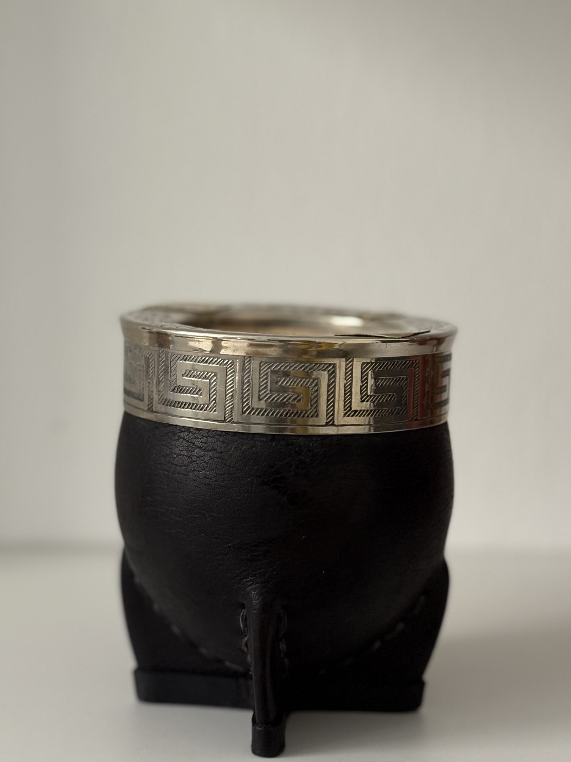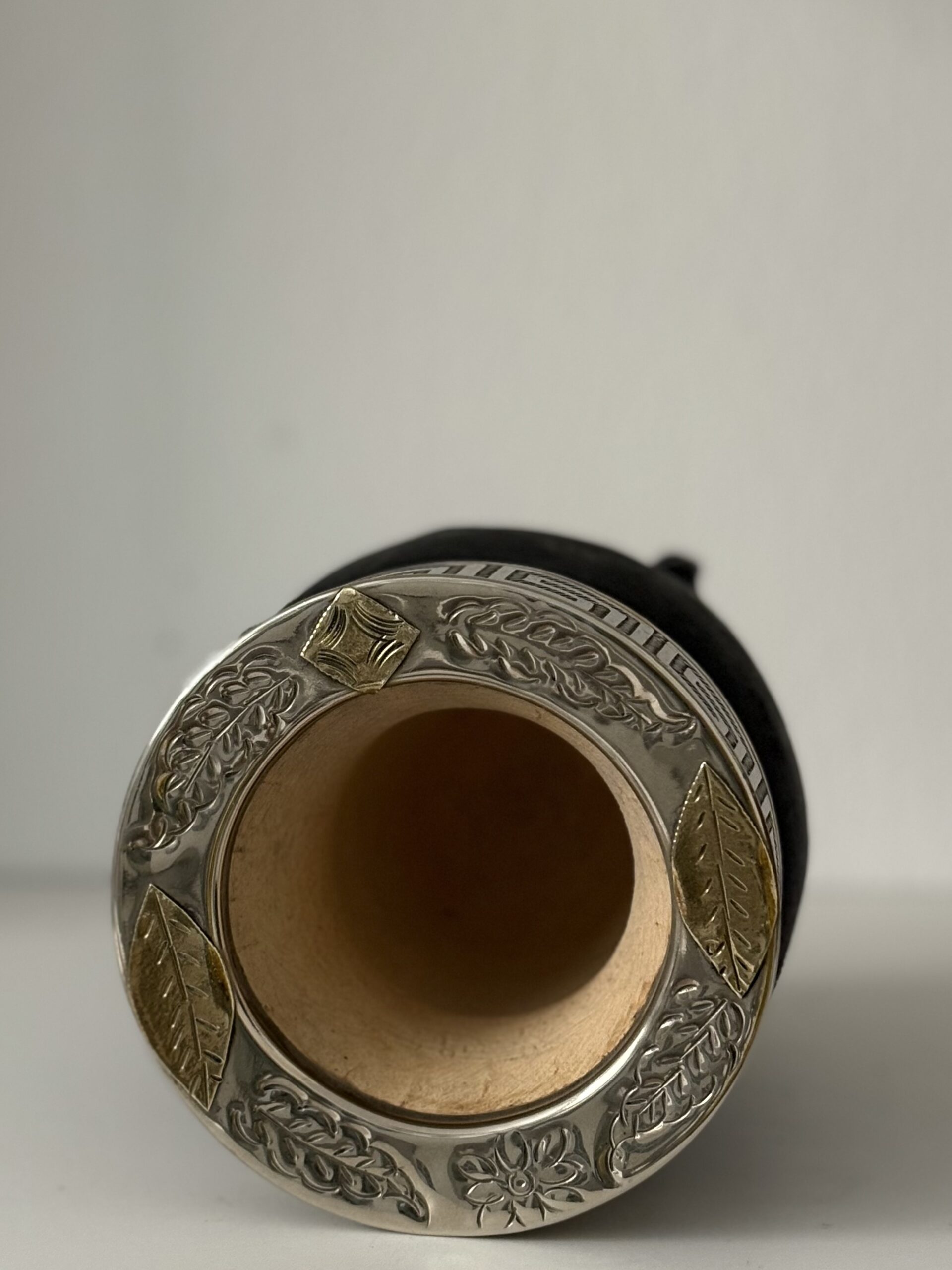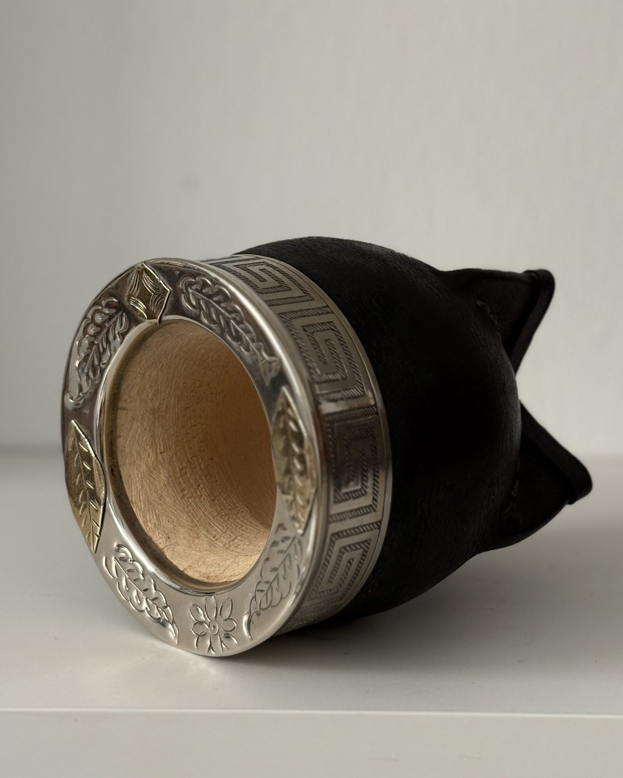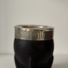 Mate imperial elaborado en calabaza natural, forrado en cuero negro. Incorpora virola y cinta de alpaca cinceladas a mano, con dijes de bronce que aportan un detalle distintivo y elegante.