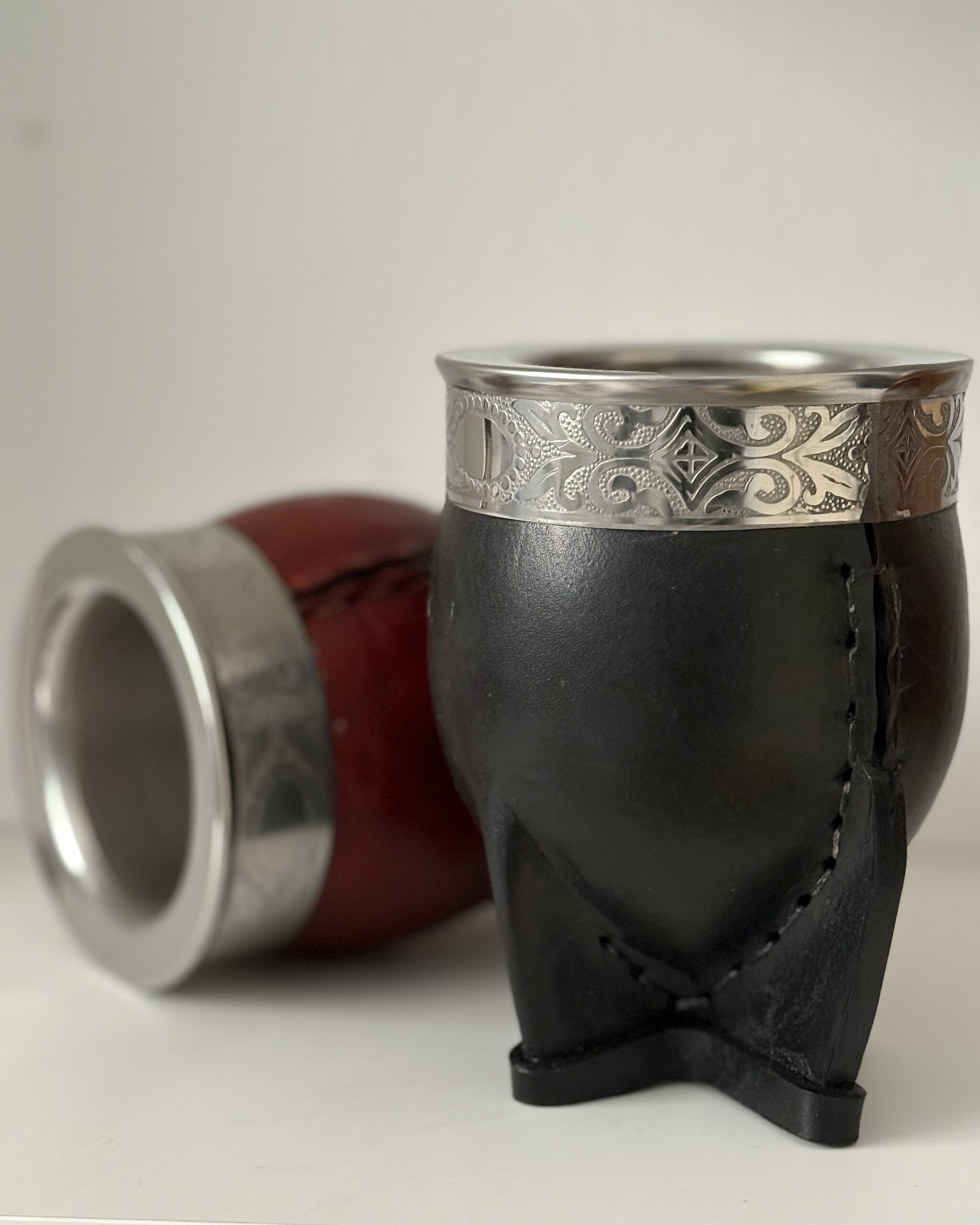 Mate imperial con un interior de acero inoxidable, forrado en cuero, virola y cinta cincelada en acero inoxidable.