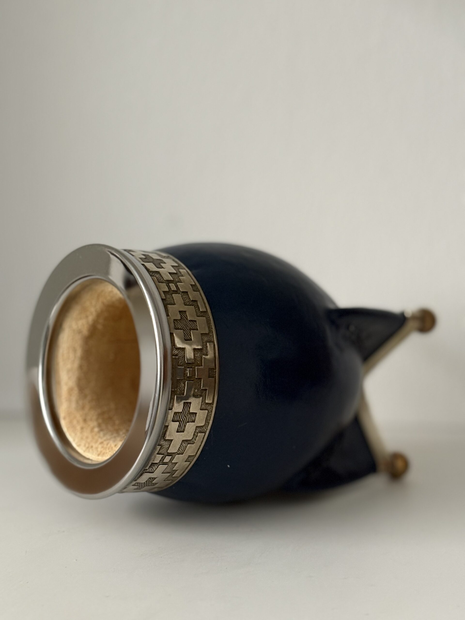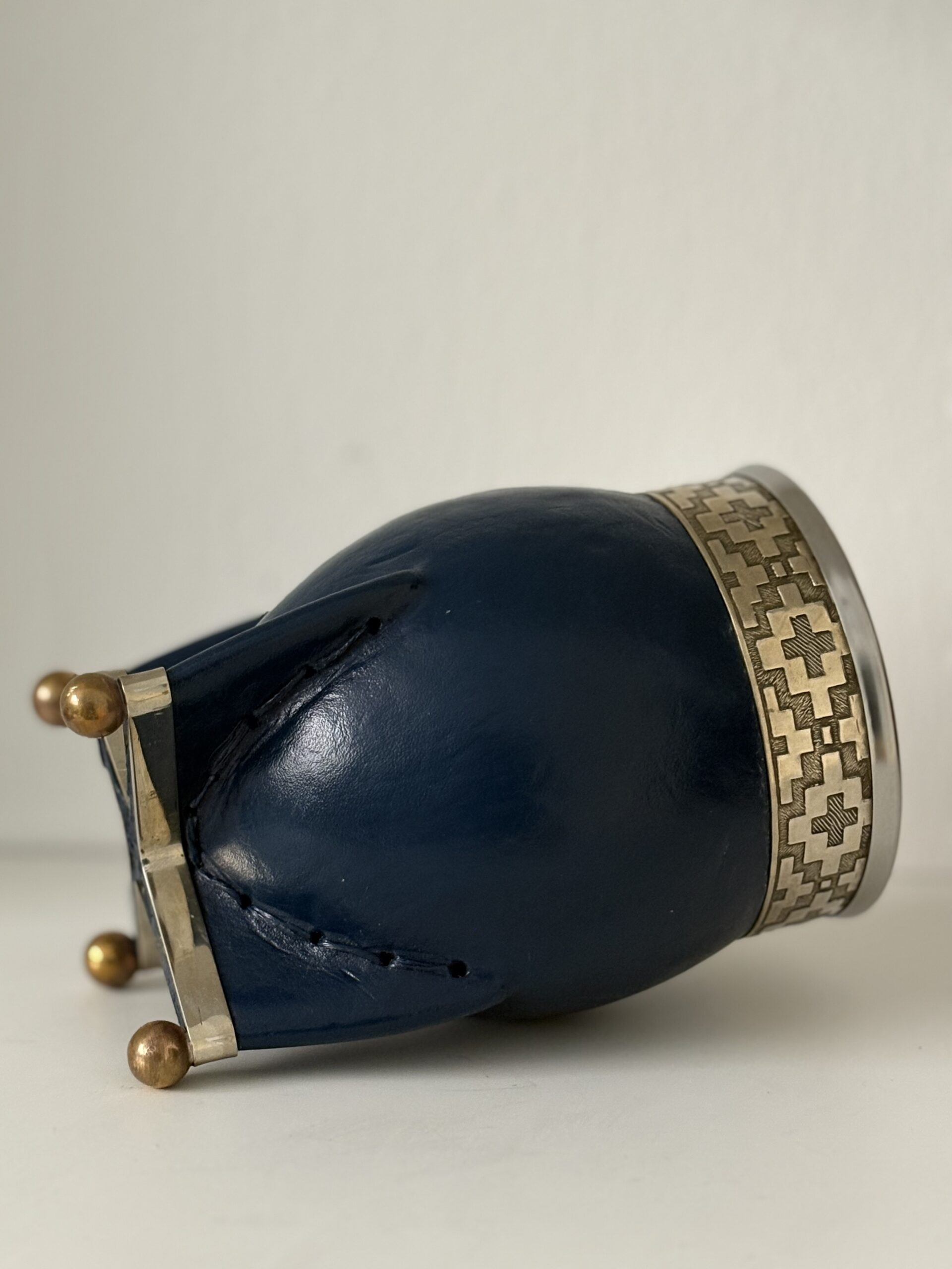 Mate imperial premium, con un interior de calabaza forrado en cuero azul. Virola, fleje y base