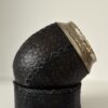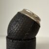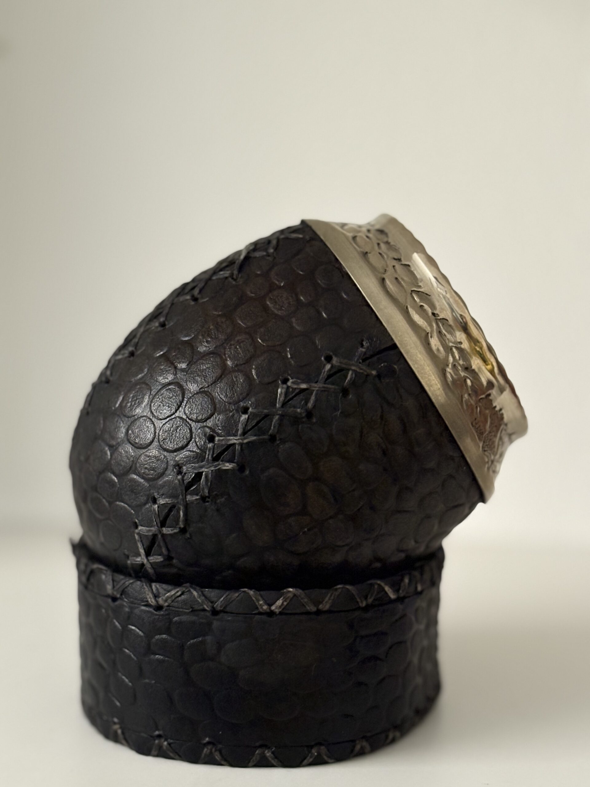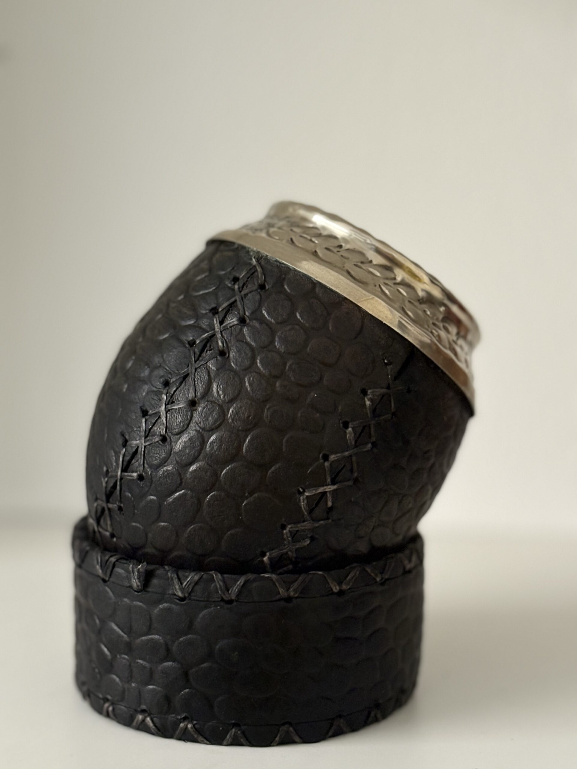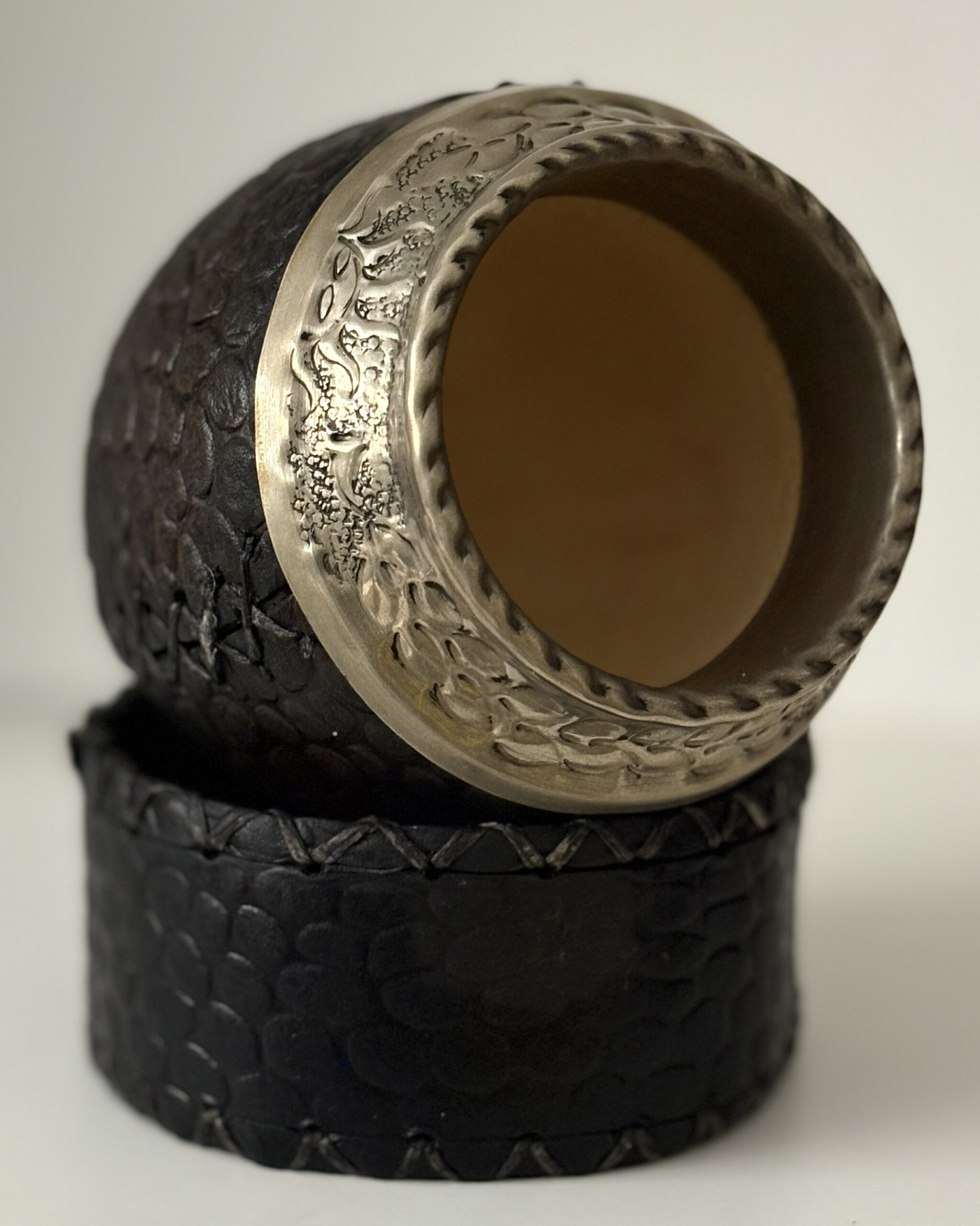 Mate torpedo criollo, interior de calabaza, forrado y con una base en cuero tipo croco, virola de alpaca cincelada.