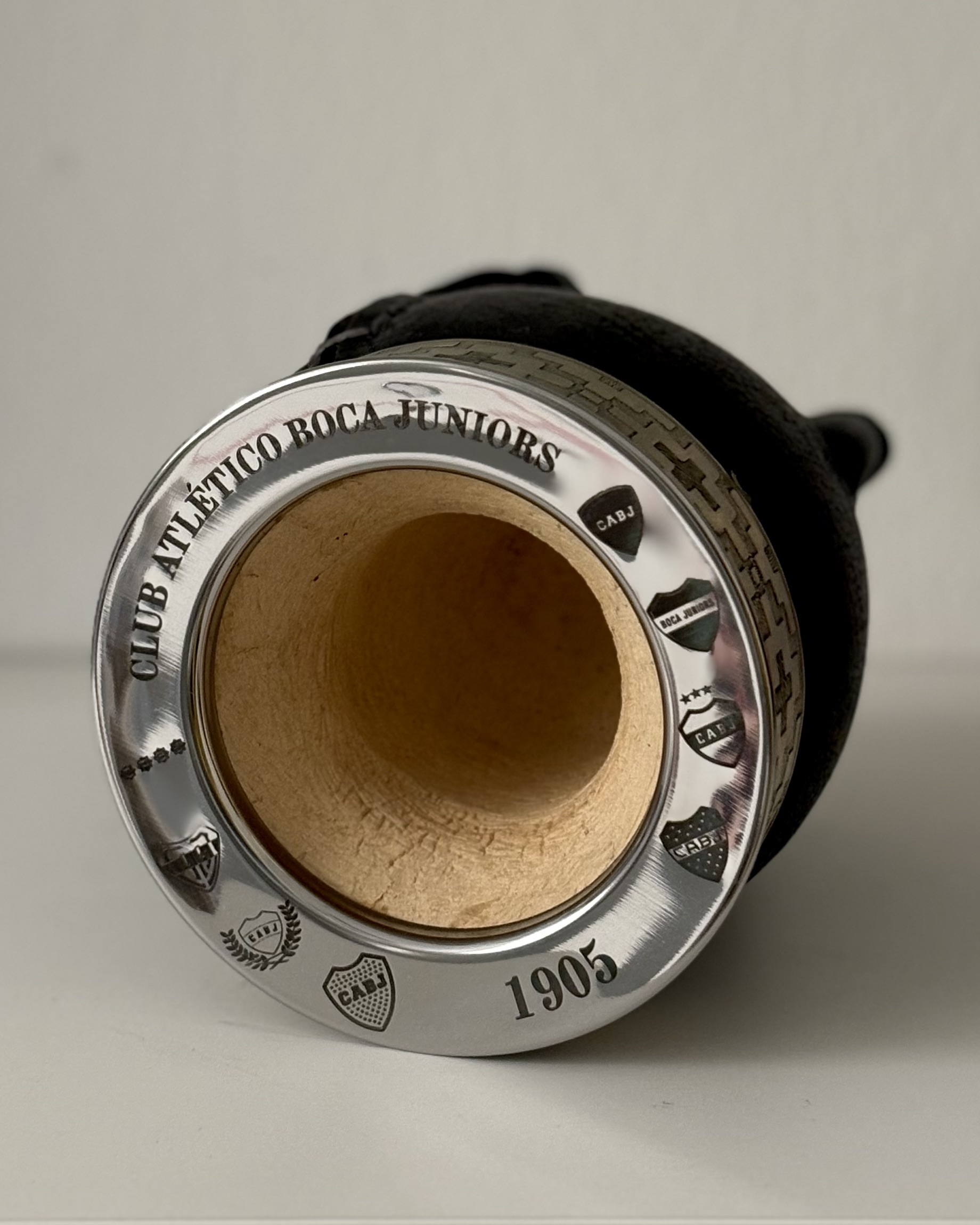 Mate imperial grabado en láser edición Boca Juniors, con un interior de calabaza forrado en cuero negro, virola de acero inoxidable y cinta en alpaca cincelada