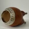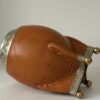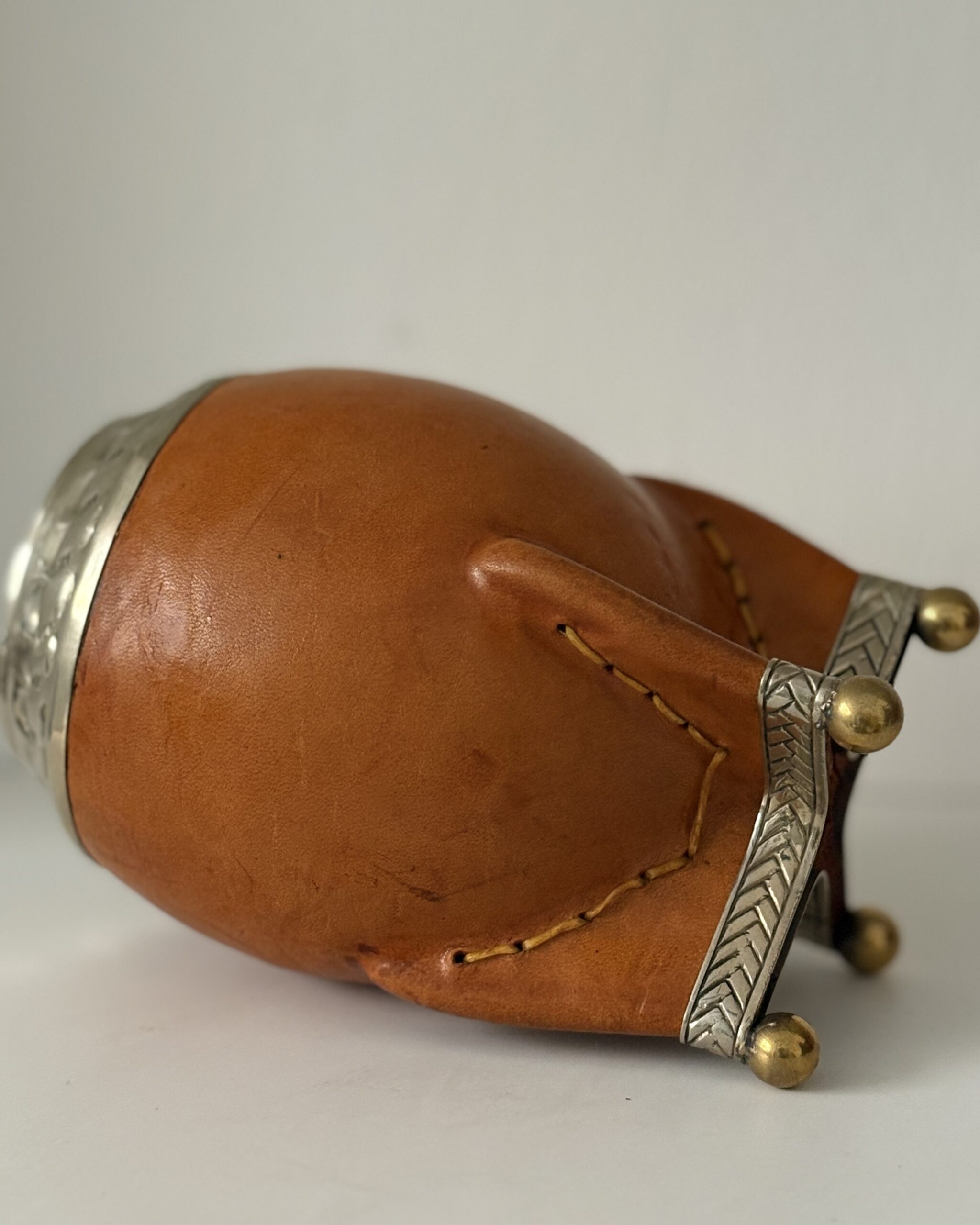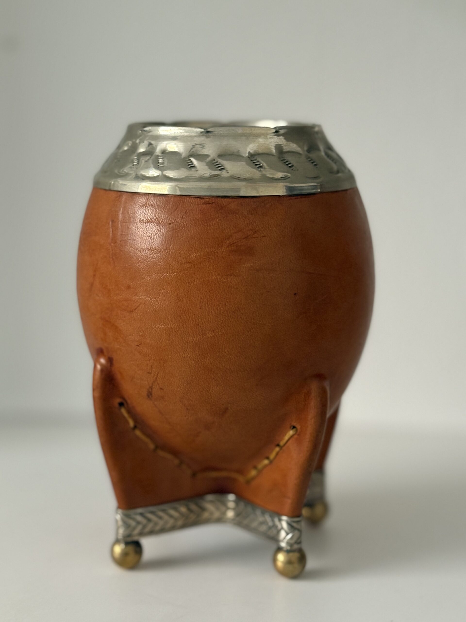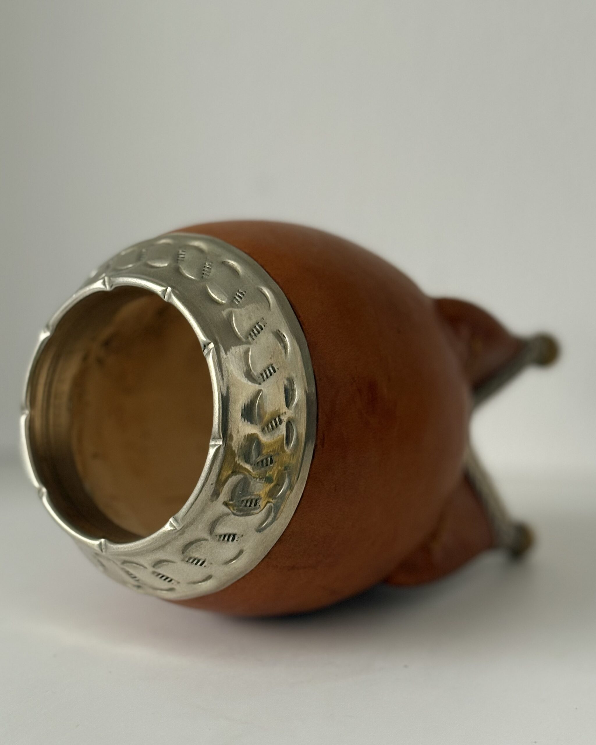 Mate torpedo con interior en calabaza, forrado en 100% cuero color suela. Virola y base en alpaca cincelada, con detalles en bronce.