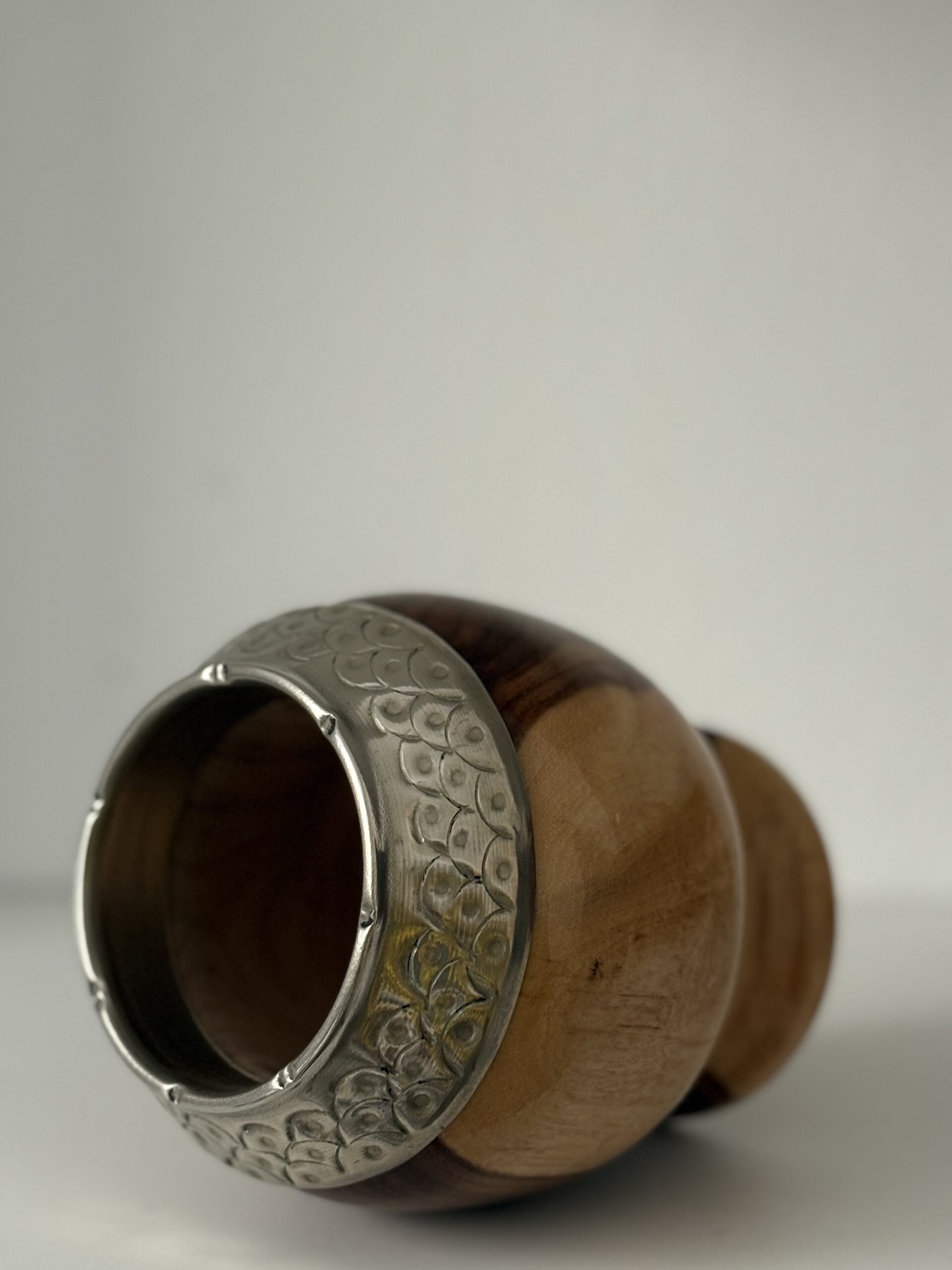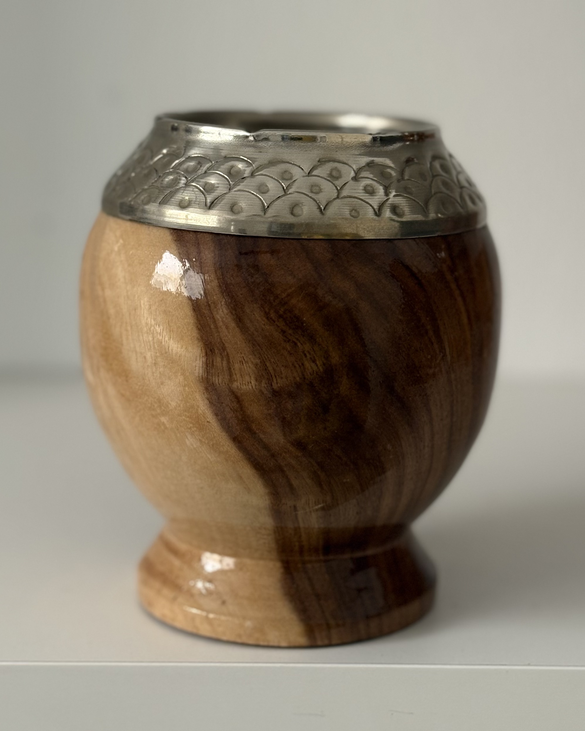 Mate torpedo de algarrobo 100%, con terminación brillante, virola de alpaca cincelada artesanalmente, que aporta un acabado elegante pero tradicional.